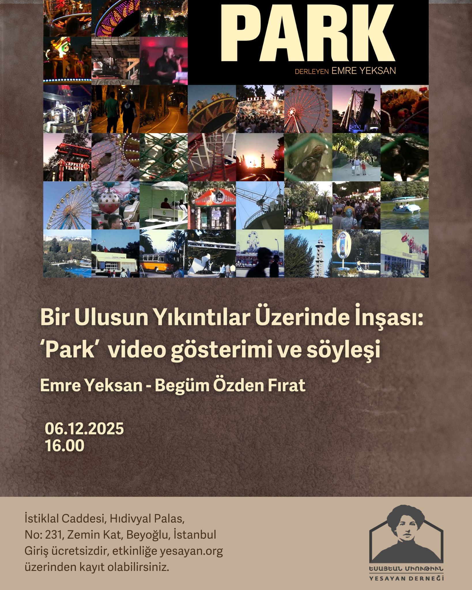 6 Aralık Cumartesi günü, ‘Park’ isimli kısa videoyu, derleyeni Emre Yeksan ve akademisyen Begüm Özden Fırat‘la birlikte izleyeceğiz. Gösterimin ardından Yeksan ve Fırat film, İzmir yangını, şehirde ulusal bilincin mekân aracılığıyla inşası ve bu inşa için feda edilen yıkım üzerine konuşacak.